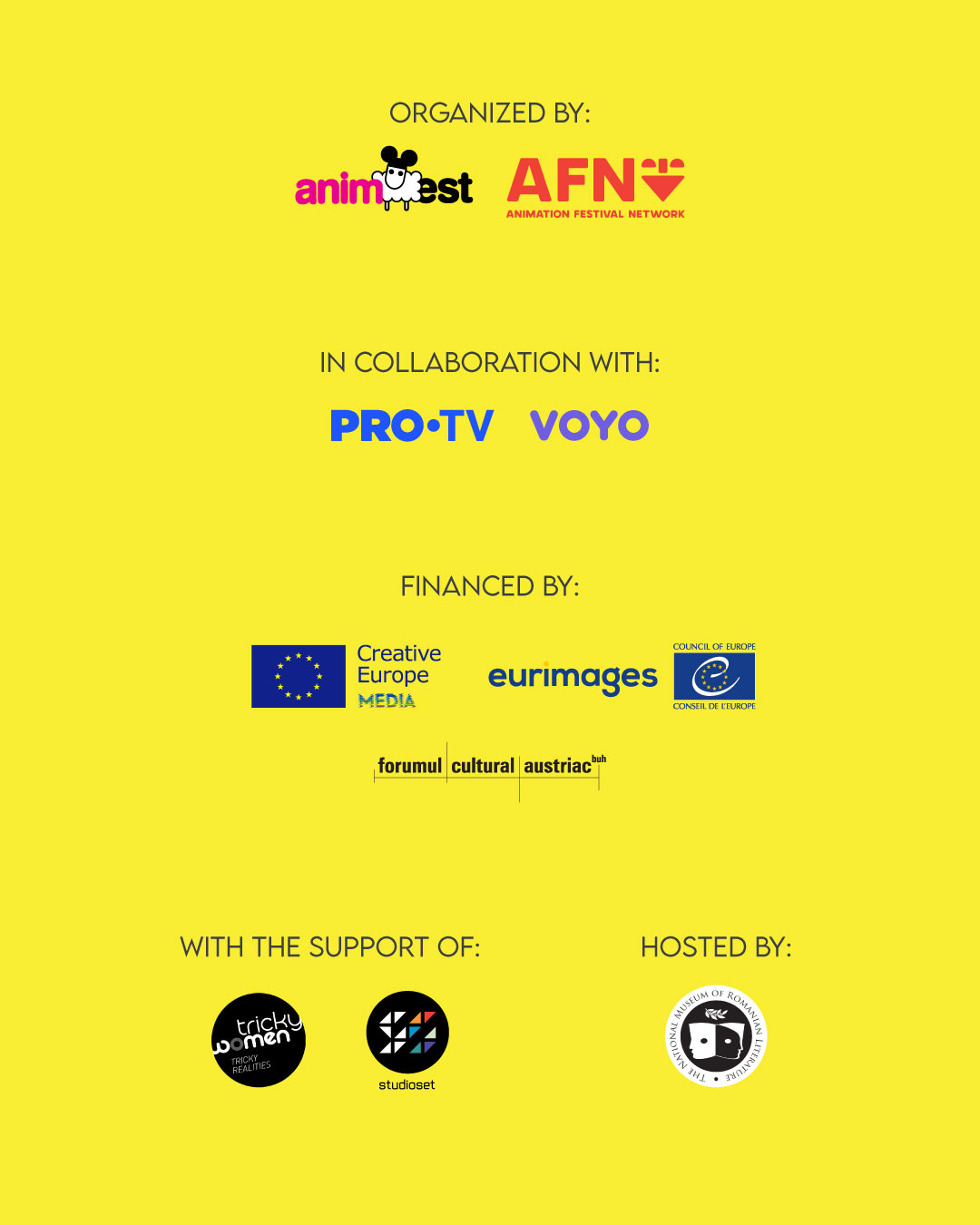SYAA is co-organised by Animest and AFN, with the support of PRO TV and VOYO, co-financed by Creative Europe MEDIA Programme of the European Union and Eurimages, with the support of Austrian Cultural Forum.